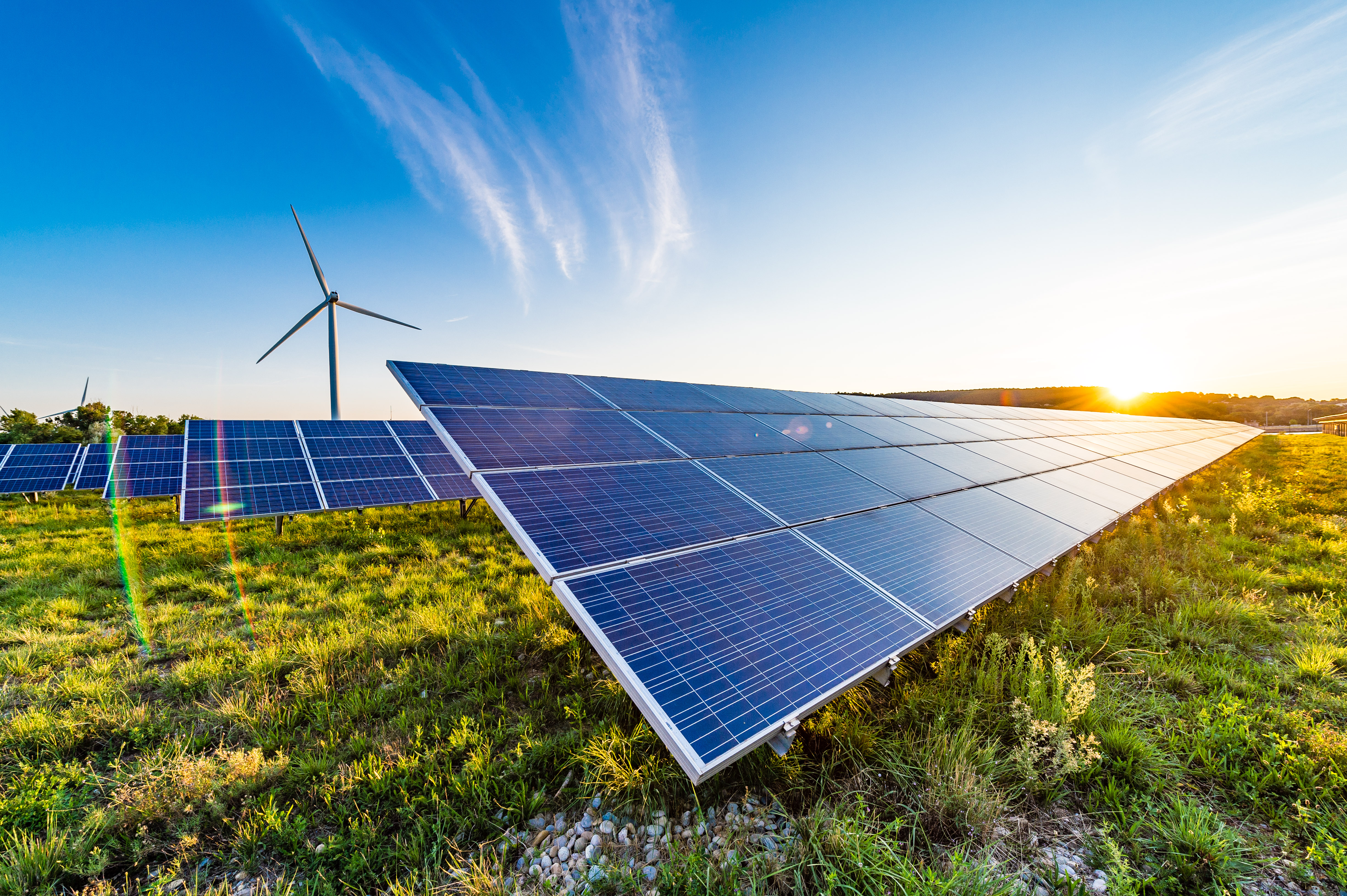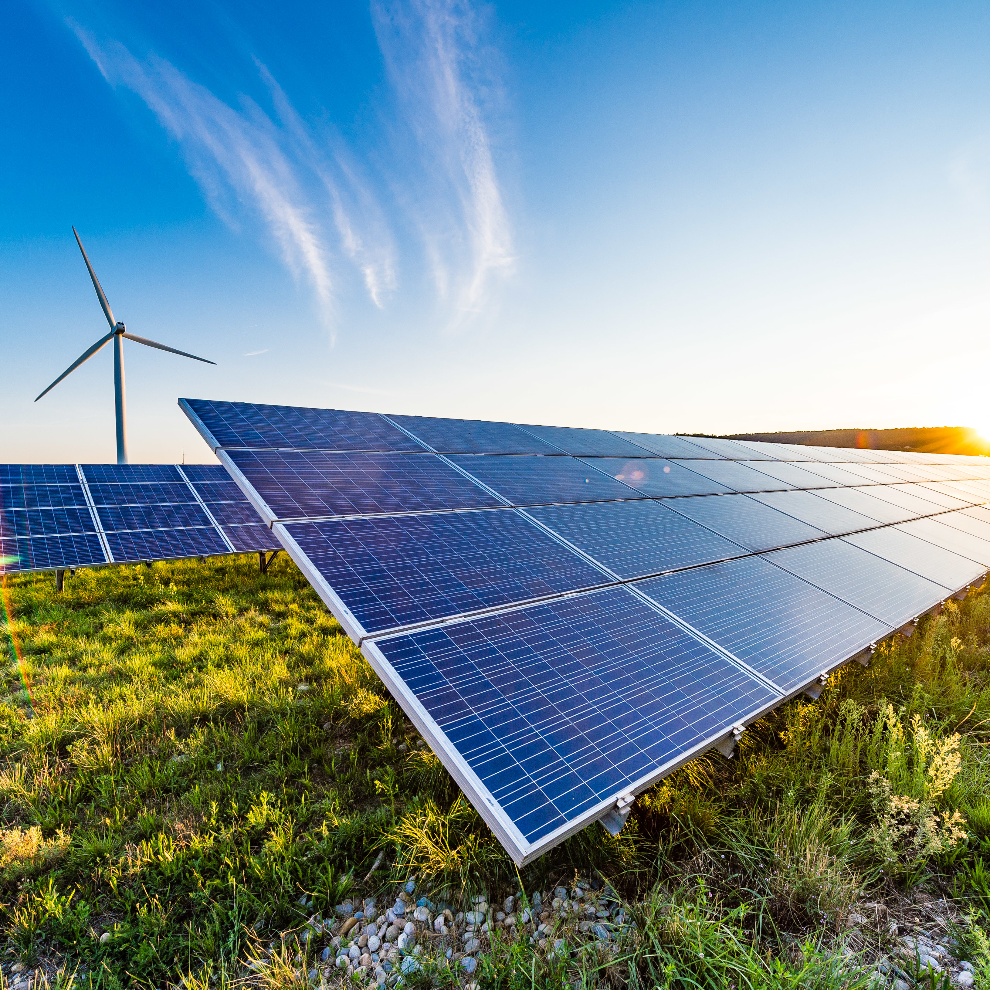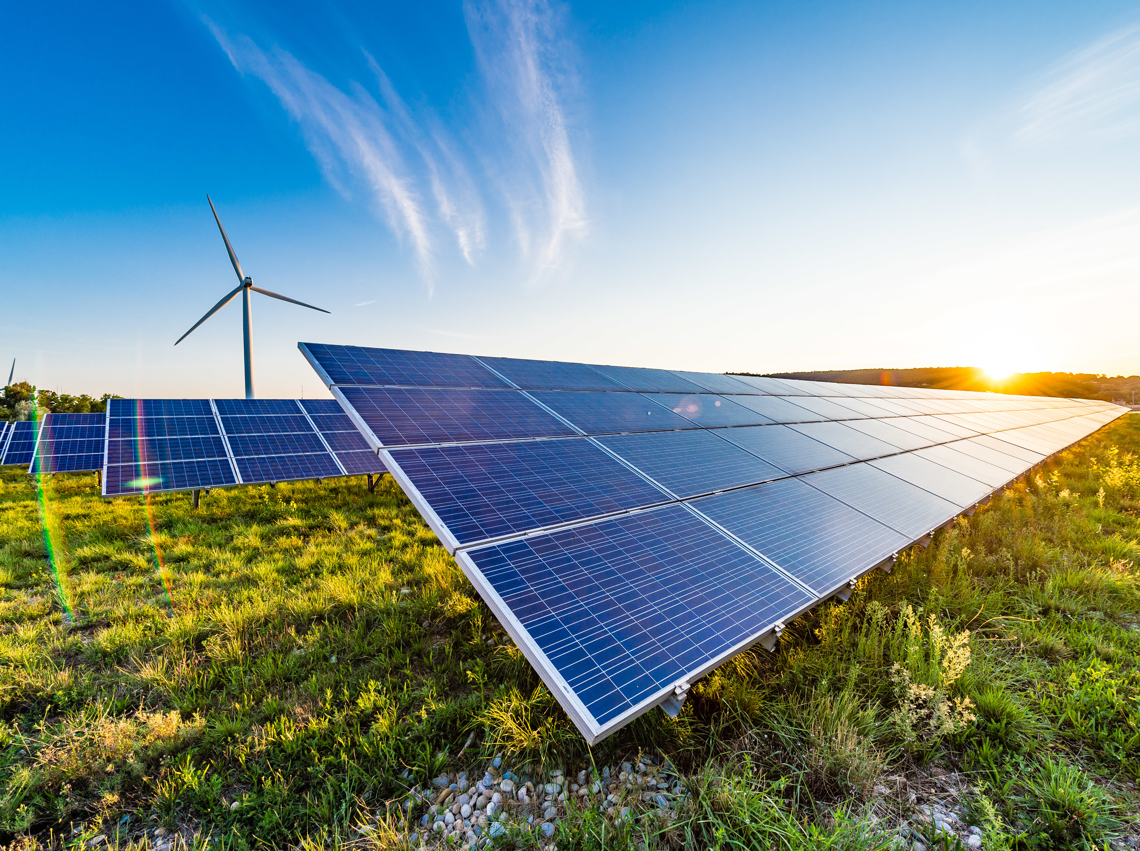 Vue du parc photovoltaïque au lever du soleil.